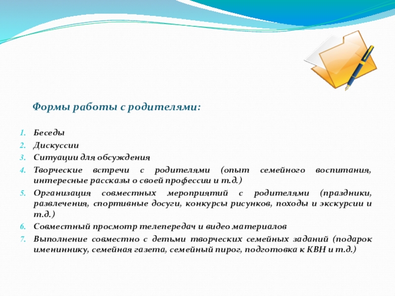 Слайд 15 Формы работы с родителями: