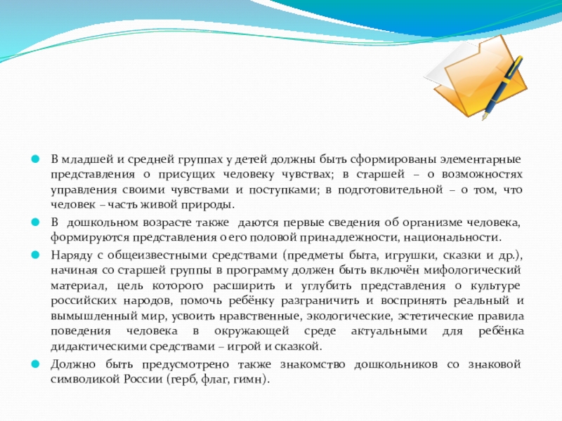 В дошкольном возрасте также даются первые сведения об организме человека, формируются представления о его половой принадлежности, национальности.