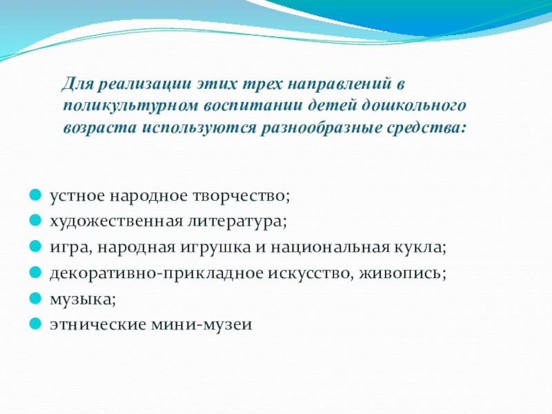 Слайд 8Для реализации этих трех направлений в поликультурном воспитании детей дошкольного возраста