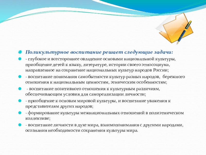 Слайд 5Поликультурное воспитание решает следующие задачи: