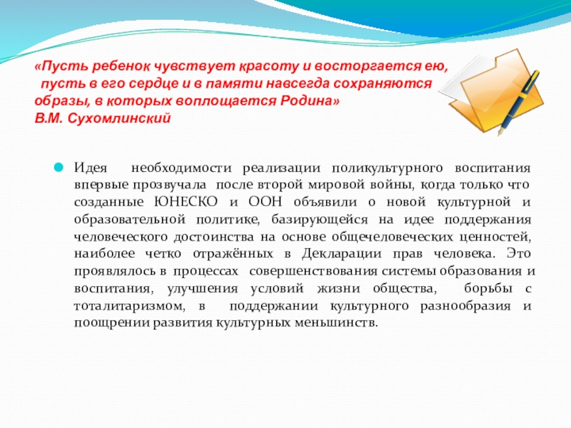 Идея необходимости реализации поликультурного воспитания впервые прозвучала после второй мировой войны, когда только что созданные ЮНЕСКО и ООН объявили о новой культурной и образовательной политике, базирующейся на идее поддержания человеческого достоинства на основе общечеловеческих ценностей, наиболее четко отражённых в Декларации прав человека. Это проявлялось в процессах совершенствования системы образования и воспитания, улучшения условий жизни общества, борьбы с тоталитаризмом, в поддержании культурного разнообразия и поощрении развития культурных меньшинств.