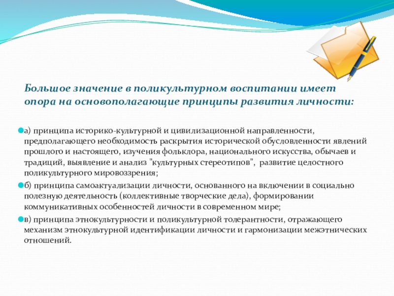 Слайд 6Большое значение в поликультурном воспитании имеет опора на основополагающие принципы развития