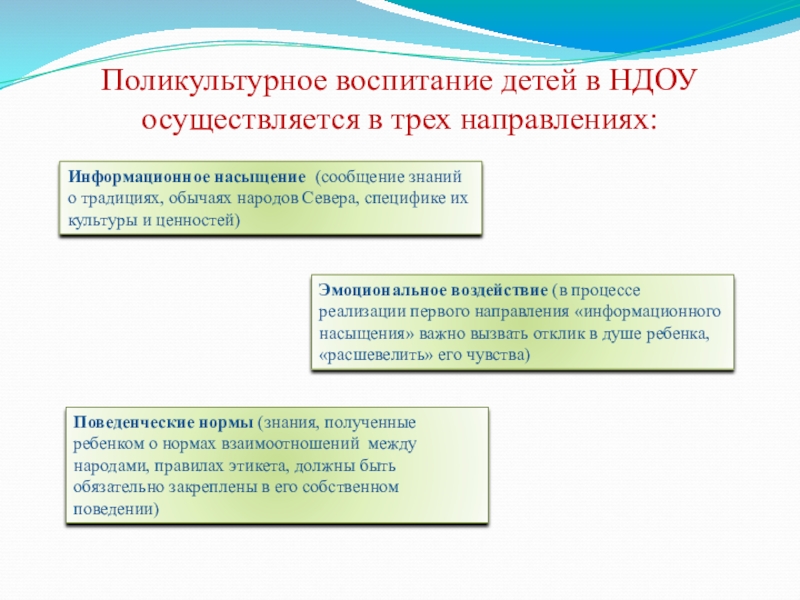 Слайд 7Поликультурное воспитание детей в НДОУ осуществляется в трех направлениях: