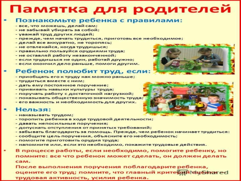 Поддержка взрослого состоит и в подбадривании ребенка, и в разумной помощи, в указаниях не торопиться, делать все аккуратно. Одобрение взрослого, похвала, показ образцов труда ребенка близким, товарищам, советы, как выполнить задания, совместная работа - все это в совокупности создает у него хорошее эмоциональное самочувствие, уверенность в себе,' положительное отношение к труду.