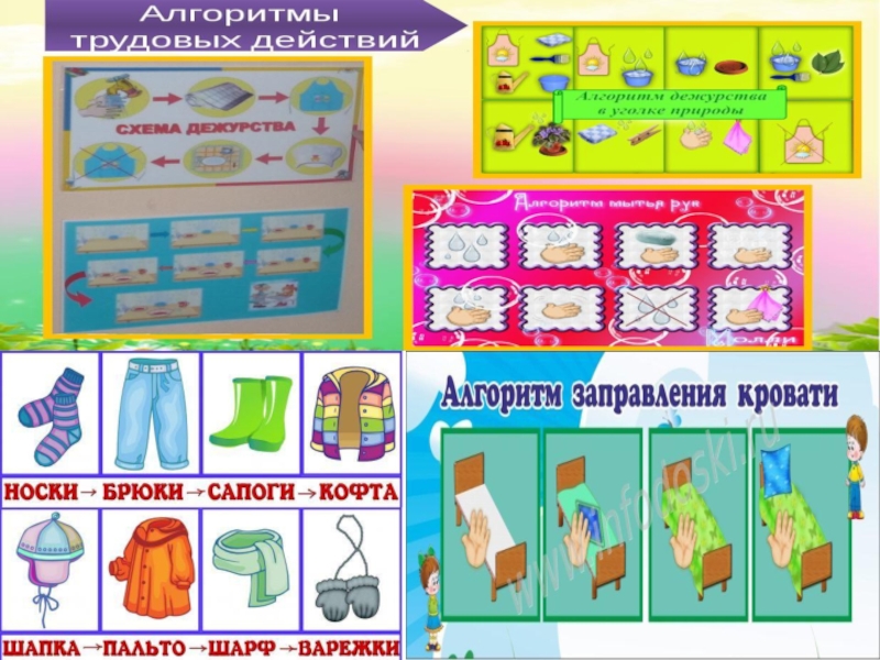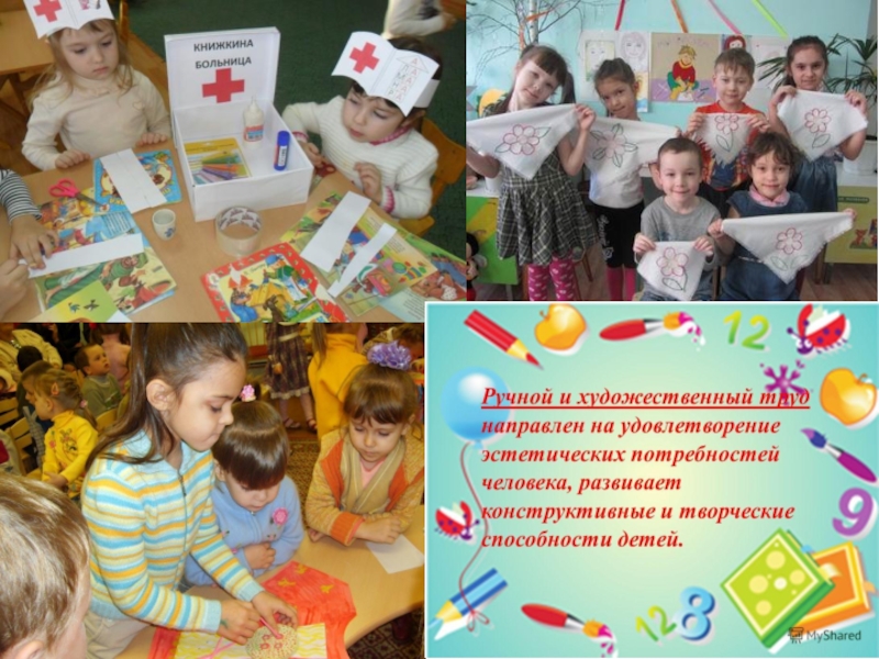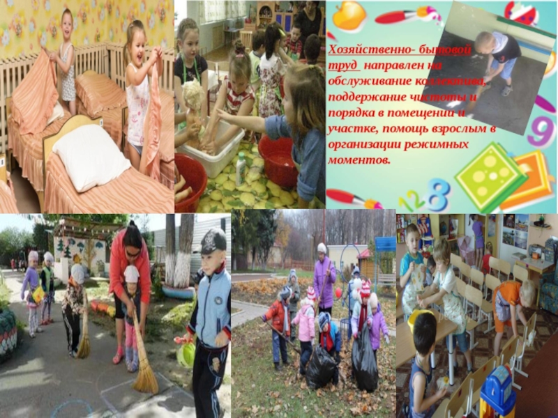 Большое влияние на развитие правильного отношения детей к труду оказывают условия труда. Если для работы имеется все необходимое, если оборудование прочное и удобное для выполнения различных трудовых операций, а внешне оно привлекательно и гигиенично, ребенок будет охотно им пользоваться в работе.