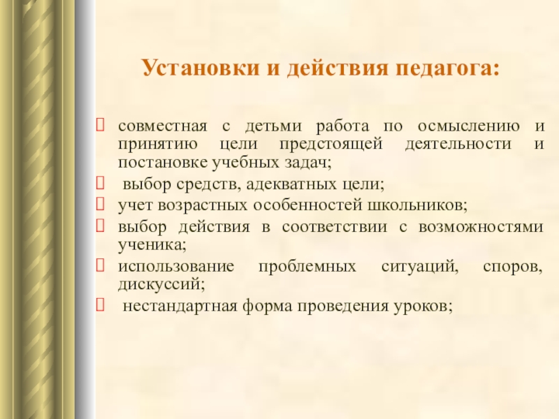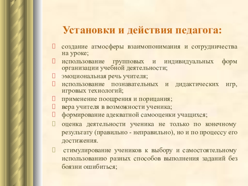 создание благоприятной психологической атмосферы, поддерживающей познавательную активность учащихся, а именно: