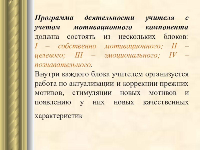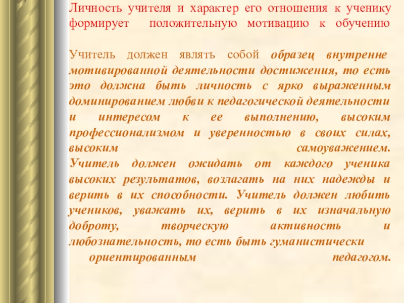Учитель должен являть собой образец внутренне мотивированной деятельности достижения, то есть это должна быть личность с ярко выраженным доминированием любви к педагогической деятельности и интересом к ее выполнению, высоким профессионализмом и уверенностью в своих силах, высоким самоуважением.
