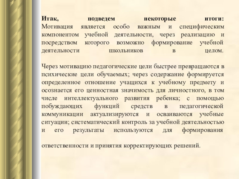 Через мотивацию педагогические цели быстрее превращаются в психические цели обучаемых; через содержание формируется определенное отношение учащихся к учебному предмету и осознается его ценностная значимость для личностного, в том числе интеллектуального развития ребенка; с помощью побуждающих функций средств в педагогической коммуникации актуализируются и осваиваются учебные ситуации; систематический контроль за учебной деятельностью и его результаты используются для формирования ответственности и принятия корректирующих решений.