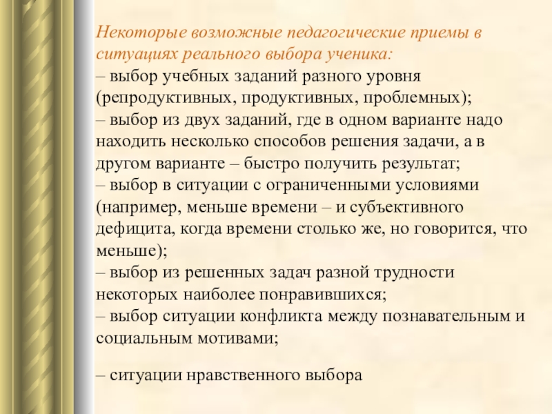 б) создание ситуаций выбора для укрепления и осознания мотивов, собственной субъективной позиции;