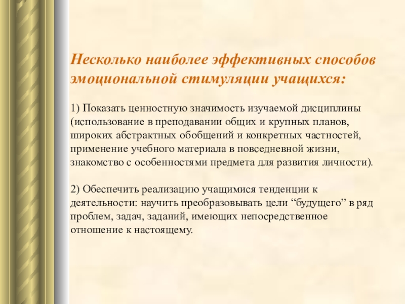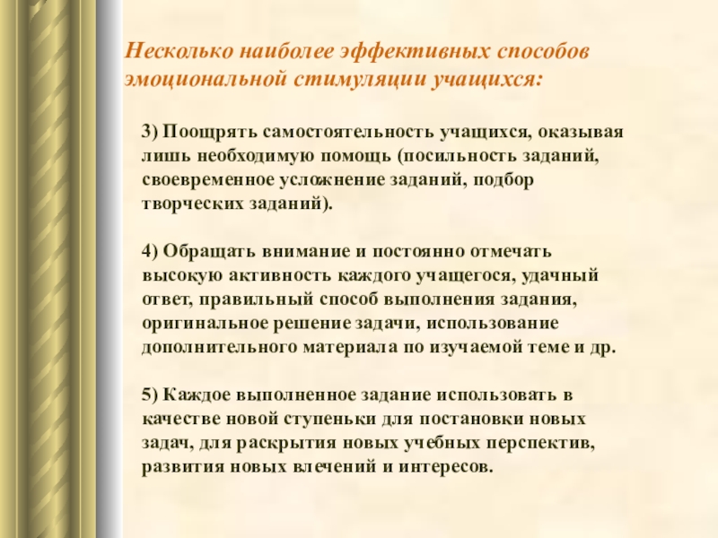 Слайд 24Несколько наиболее эффективных способов эмоциональной стимуляции учащихся:
