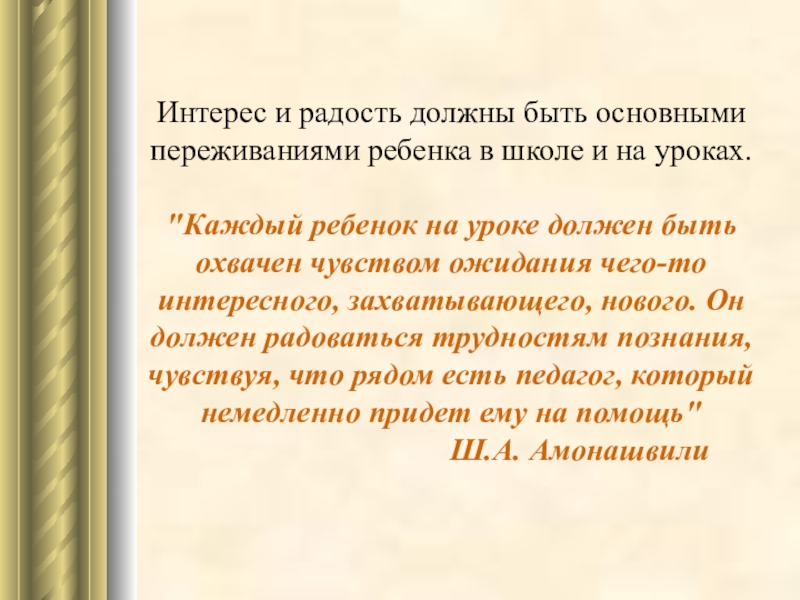 "Каждый ребенок на уроке должен быть охвачен чувством ожидания чего-то интересного, захватывающего, нового. Он должен радоваться трудностям познания, чувствуя, что рядом есть педагог, который немедленно придет ему на помощь"