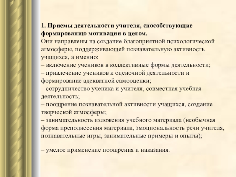 Слайд 301. Приемы деятельности учителя, способствующие формированию мотивации в целом.