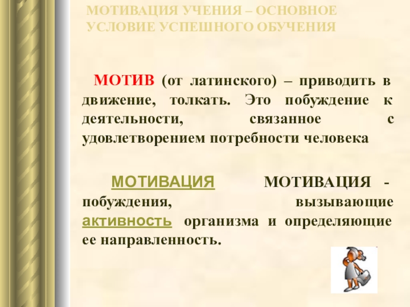 – приводить в движение, толкать. Это побуждение к деятельности, связанное с удовлетворением потребности человека