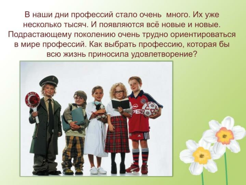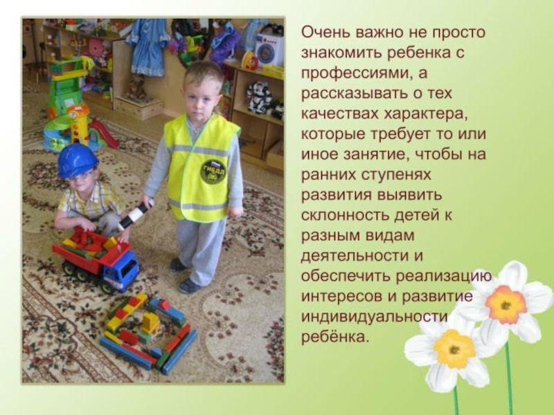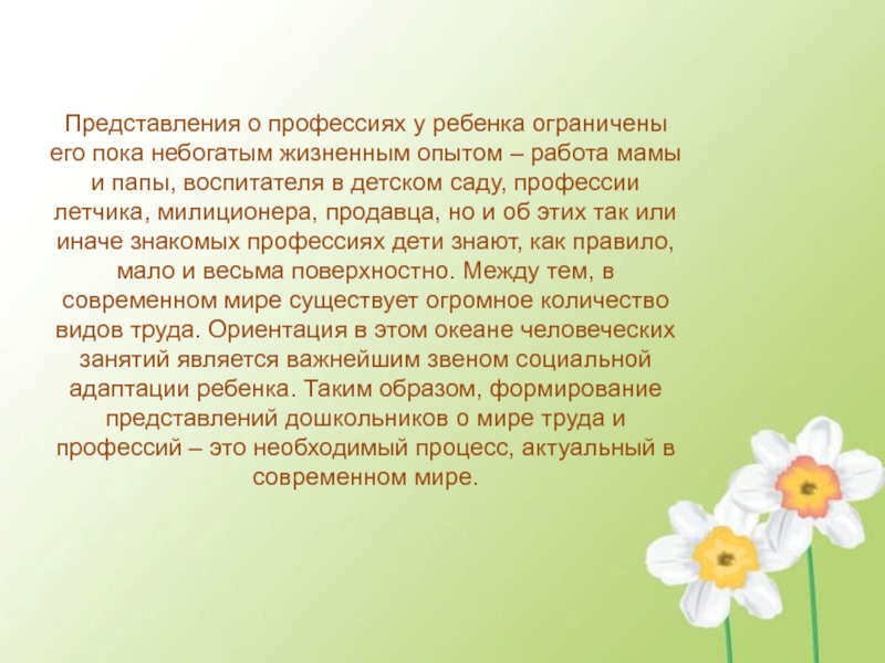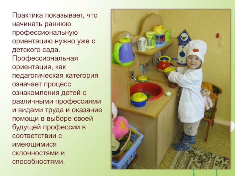 в педагогике, хотя, казалось бы, всем ясна огромная роль представлений детей о профессиях и труде. В детских садах формирование представлений о мире труда и профессий подчас осуществляется недостаточно целенаправленно и систематически, так как перед дошкольниками не стоит проблема выбора профессии. Но поскольку профессиональное самоопределение взаимосвязано с развитием личности на всех возрастных этапах, то дошкольный возраст можно рассматривать как подготовительный, закладывающий основы для профессионального самоопределения в будущем.