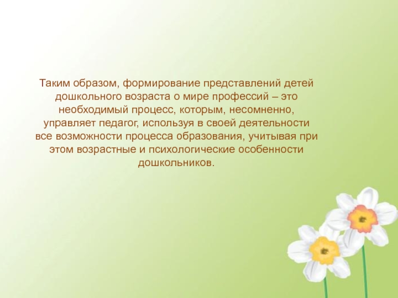 Слайд 14Таким образом, формирование представлений детей дошкольного возраста о мире профессий –