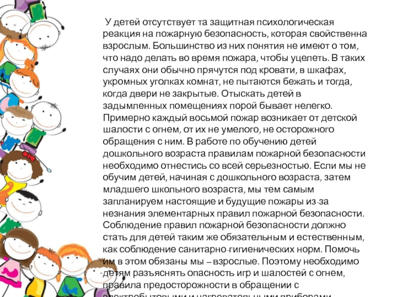 Слайд 2 У детей отсутствует та защитная психологическая реакция на пожарную безопасность,