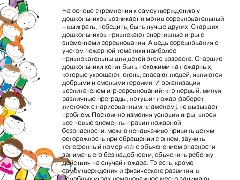 – выиграть, победить, быть лучше других. Старших дошкольников привлекают спортивные игры с элементами соревнования. А ведь соревнования с учетом пожарной тематики наиболее привлекательны для детей этого возраста. Старшие дошкольники хотят быть похожими на пожарных, которые укрощают огонь, спасают людей, являются добрыми и смелыми героями. И организация воспитателем игр-соревнований: кто первый, минуя различные преграды, потушит пожар (заберет листочек с нарисованным пламенем), не вызывает проблем. Постоянно изменяя условия игры, внося все новые элементы правил пожарной безопасности, можно ненавязчиво привить детям осторожность при обращении с огнем, заучить телефонный номер «01» с объяснением опасности занимать его без надобности, объяснить ребенку действия на случай пожара. То есть, кроме самоутверждения и физического развития, в подобных играх немаловажное место занимают познавательные мотивы