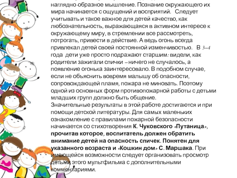 этого возраста характерно наглядно-действенное и наглядно-образное мышление. Познание окружающего их мира начинается с ощущений и восприятий. Следует учитывать и такое важное для детей качество, как любознательность, выражающаяся в активном интересе к окружающему миру, в стремлении все рассмотреть, потрогать, привести в действие. А ведь огонь всегда привлекал детей своей постоянной изменчивостью. В 3–4 года дети уже просто подражают старшим: видели, как родители зажигали спички – ничего не случалось, а появление огонька заинтересовало. В подобном случае, если не объяснить вовремя малышу об опасности, сопровождающей пламя, пожара не миновать. Поэтому одной из основных форм противопожарной работы с детьми младших групп должно быть общение.