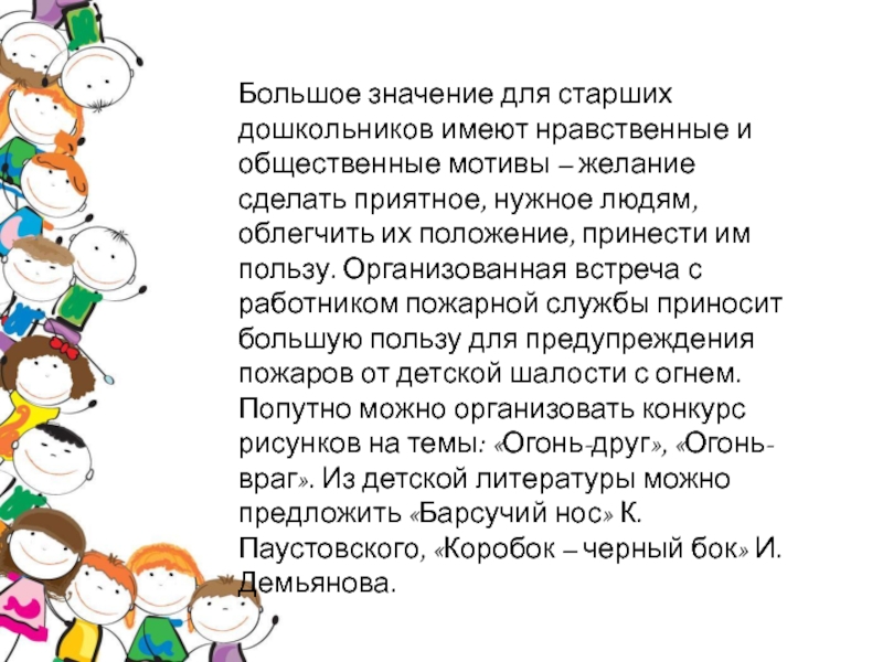 желание сделать приятное, нужное людям, облегчить их положение, принести им пользу. Организованная встреча с работником пожарной службы приносит большую пользу для предупреждения пожаров от детской шалости с огнем. Попутно можно организовать конкурс рисунков на темы: «Огонь-друг», «Огонь-враг». Из детской литературы можно предложить «Барсучий нос» К. Паустовского, «Коробок – черный бок» И. Демьянова.