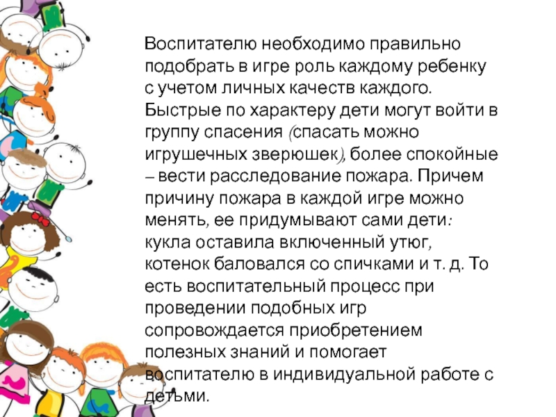 Слайд 8Воспитателю необходимо правильно подобрать в игре роль каждому ребенку с учетом