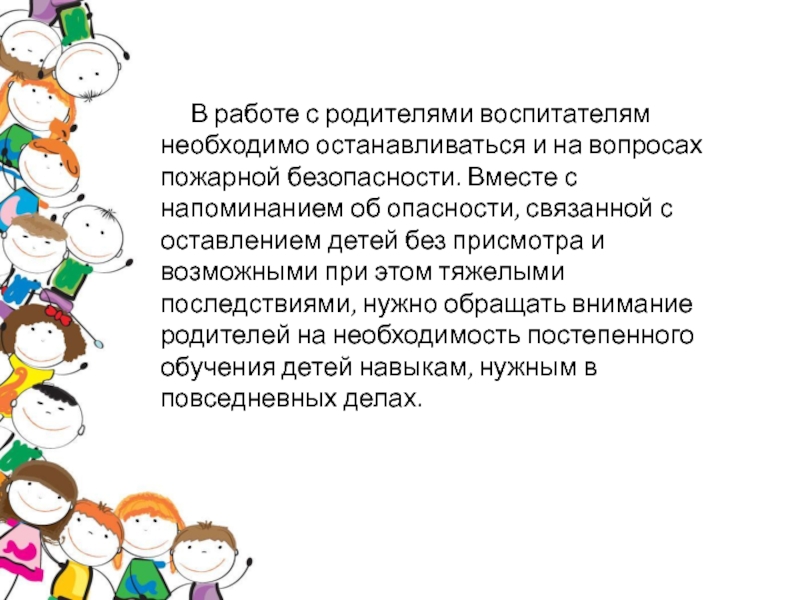 пожарной безопасности. Вместе с напоминанием об опасности, связанной с оставлением детей без присмотра и возможными при этом тяжелыми последствиями, нужно обращать внимание родителей на необходимость постепенного обучения детей навыкам, нужным в повседневных делах.