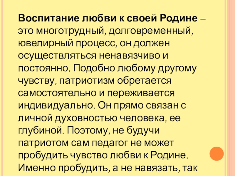 должен осуществляться ненавязчиво и постоянно. Подобно любому другому чувству, патриотизм обретается самостоятельно и переживается индивидуально. Он прямо связан с личной духовностью человека, ее глубиной. Поэтому, не будучи патриотом сам педагог не может пробудить чувство любви к Родине. Именно пробудить, а не навязать, так как в основе патриотизма лежит духовное самоопределение.