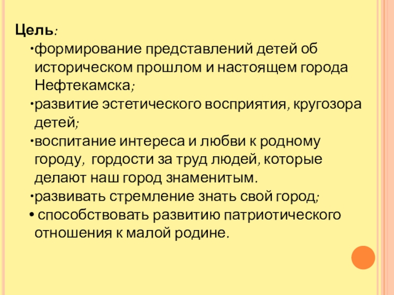 воспитание интереса и любви к родному городу, гордости за труд людей, которые делают наш город знаменитым.