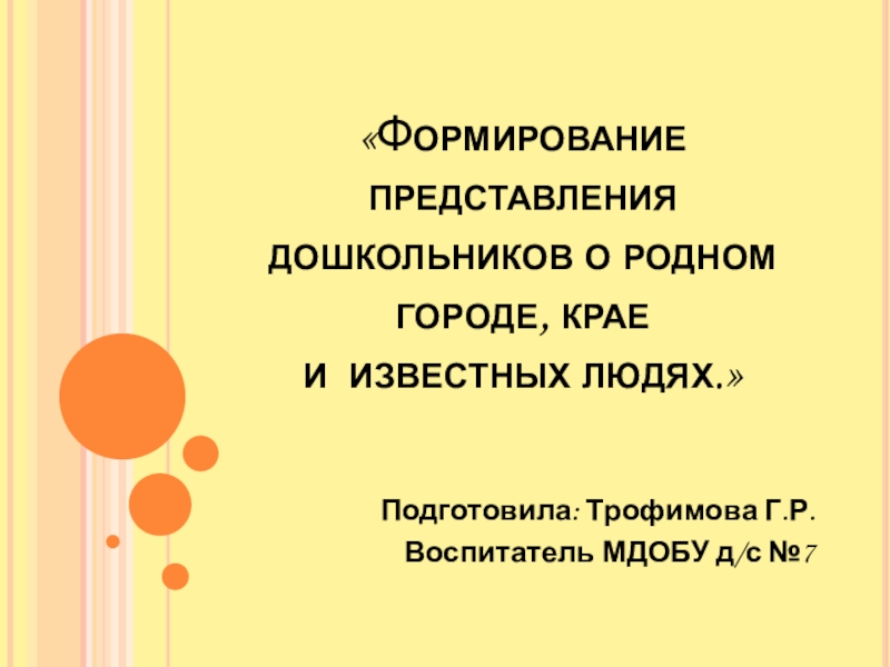 Слайд 1«Формирование представления дошкольников о родном городе, крае
