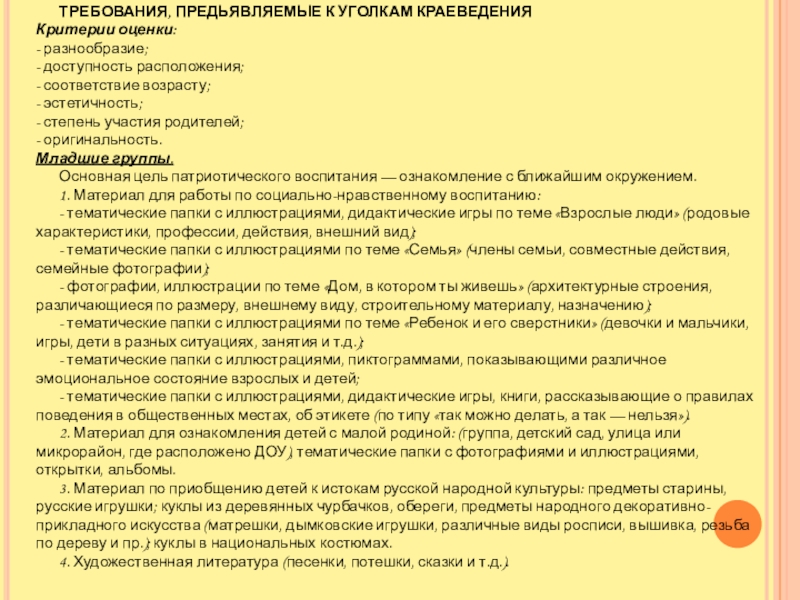 Слайд 15ТРЕБОВАНИЯ, ПРЕДЬЯВЛЯЕМЫЕ К УГОЛКАМ КРАЕВЕДЕНИЯ