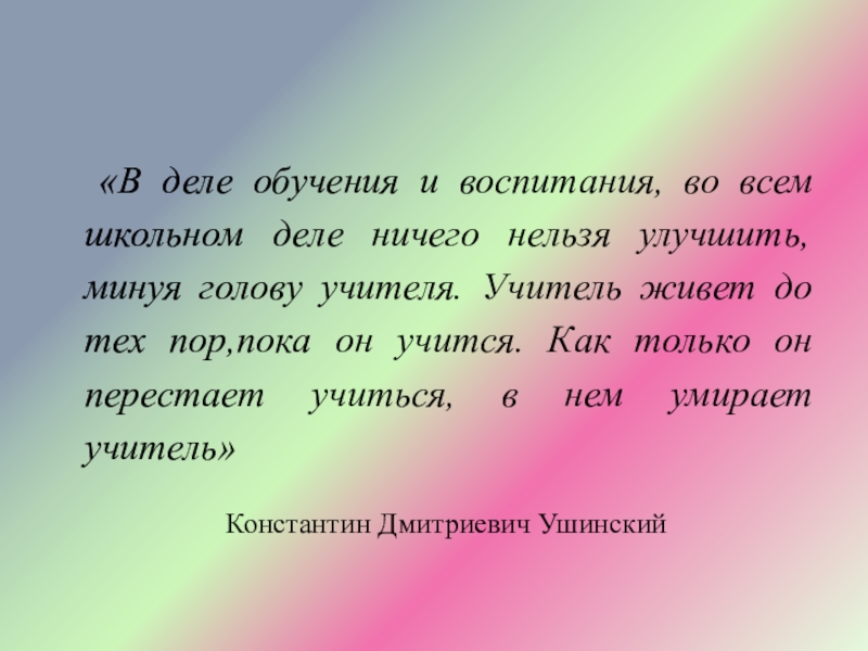 нельзя улучшить, минуя голову учителя. Учитель живет до тех пор,пока он учится. Как только он перестает учиться, в нем умирает учитель»