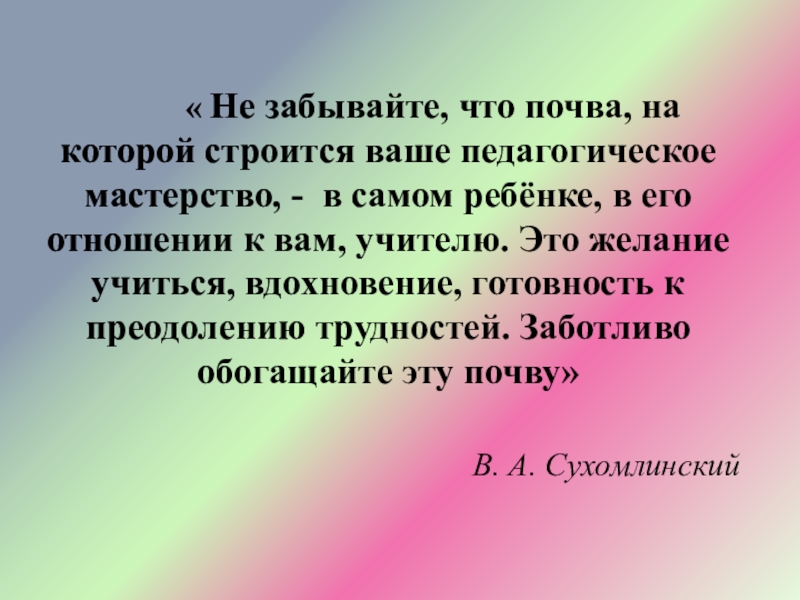 на которой строится ваше педагогическое мастерство, - в самом ребёнке, в его отношении к вам, учителю. Это желание учиться, вдохновение, готовность к преодолению трудностей. Заботливо обогащайте эту почву»