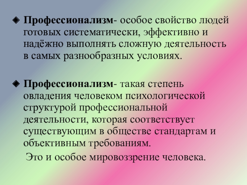 Слайд 5Профессионализм- особое свойство людей готовых систематически, эффективно и надёжно выполнять сложную