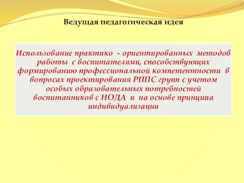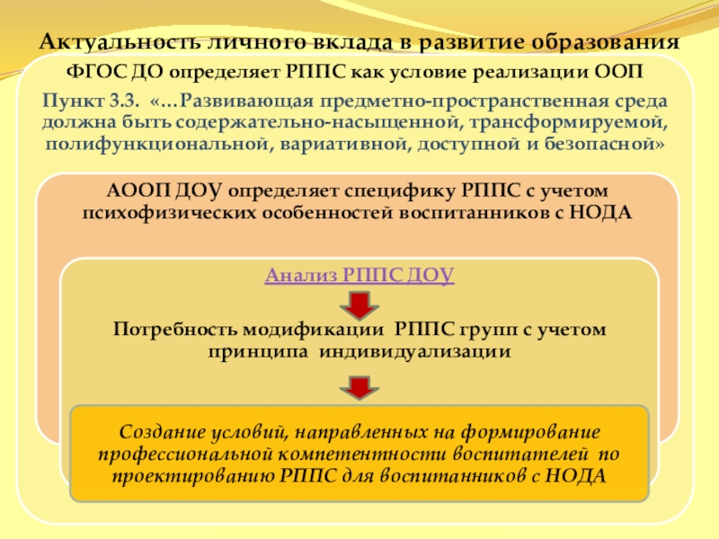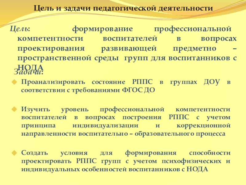 Создать условия для формирования способности проектировать РППС групп с учетом психофизических и индивидуальных особенностей воспитанников с НОДА