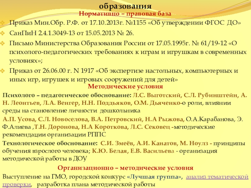 Психолого – педагогическое обоснование: Л.С. Выготский, С.Л. Рубинштейн, А.Н. Леонтьев, Л.А. Венгер, Н.Н. Поддьяков, О.М. Дьяченко-о роли, влиянии среды на становление личности дошкольника