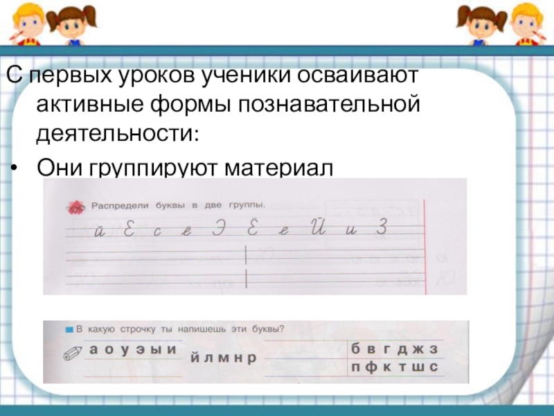 Слайд 16С первых уроков ученики осваивают активные формы познавательной деятельности: