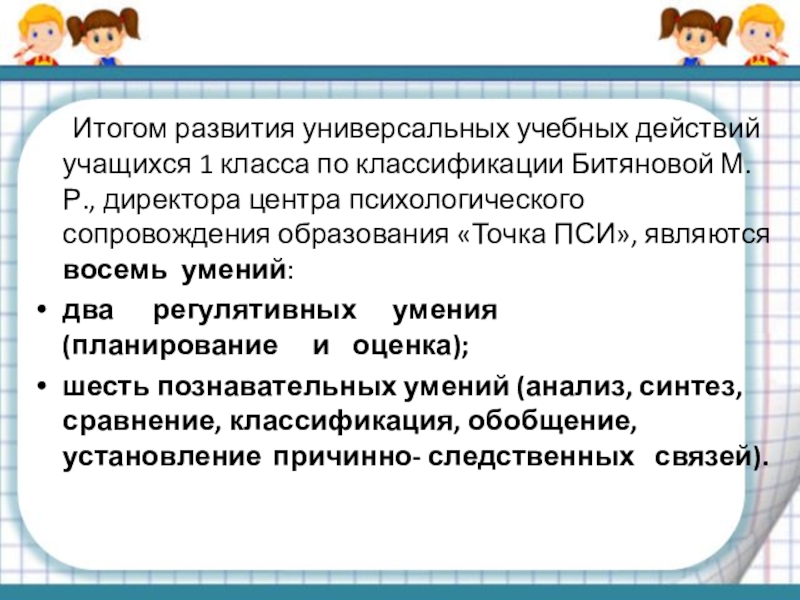 Слайд 5 Итогом развития универсальных учебных действий учащихся 1 класса по классификации Битяновой