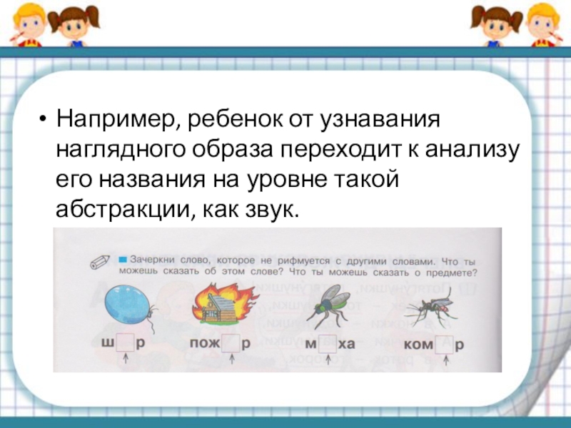Слайд 15Например, ребенок от узнавания наглядного образа переходит к анализу его названия