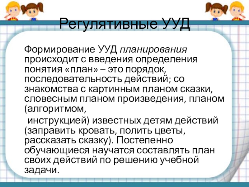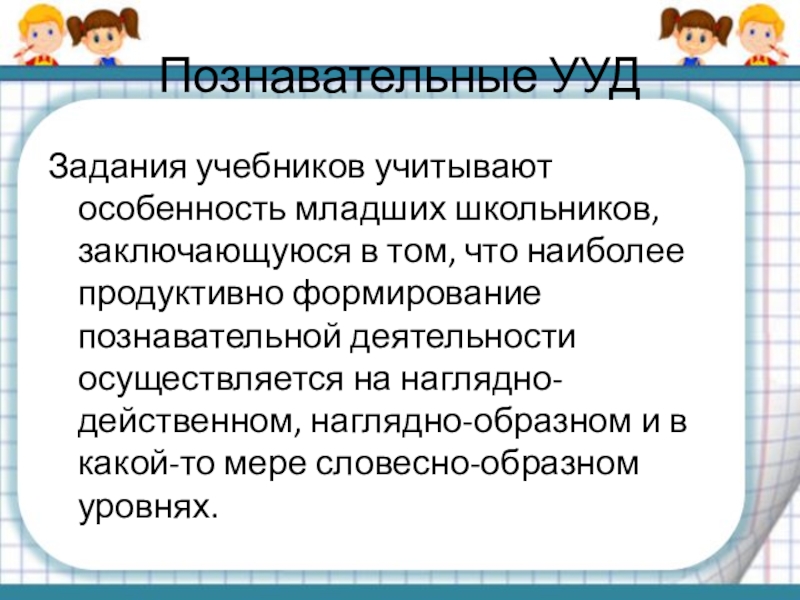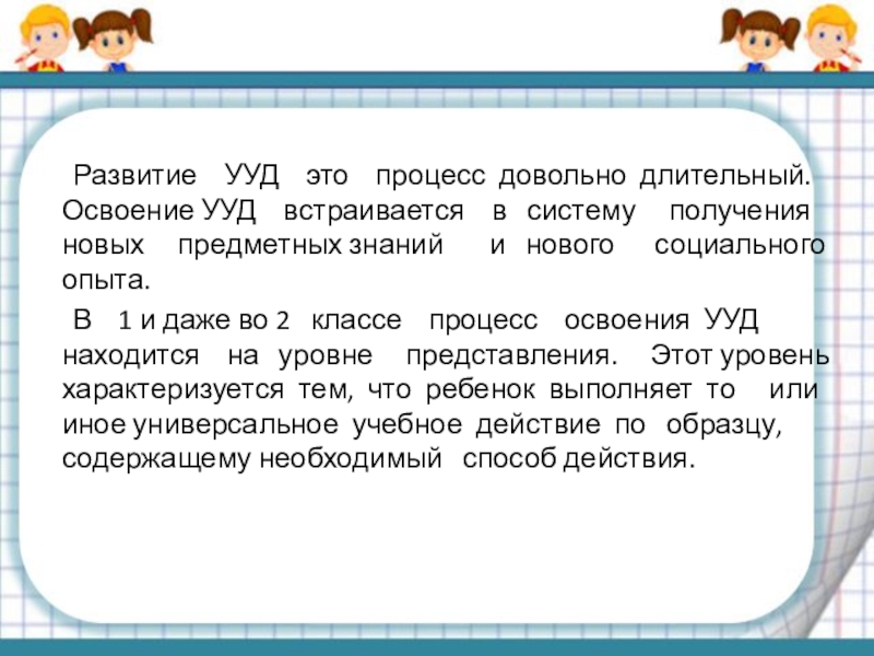 В 1 и даже во 2 классе процесс освоения УУД находится на уровне представления. Этот уровень характеризуется тем, что ребенок выполняет то или иное универсальное учебное действие по образцу, содержащему необходимый способ действия.