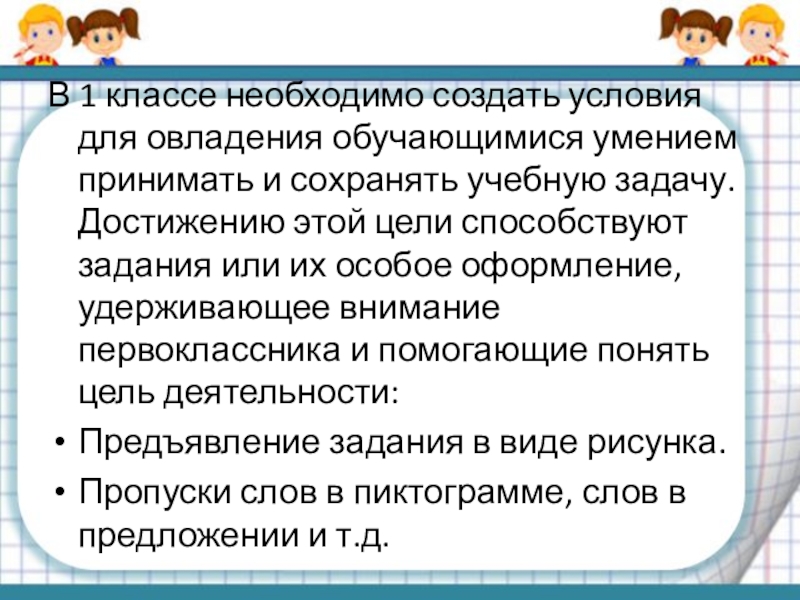и сохранять учебную задачу. Достижению этой цели способствуют задания или их особое оформление, удерживающее внимание первоклассника и помогающие понять цель деятельности: