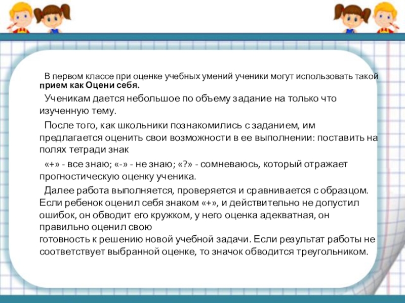 Слайд 13 В первом классе при оценке учебных умений ученики могут использовать такой