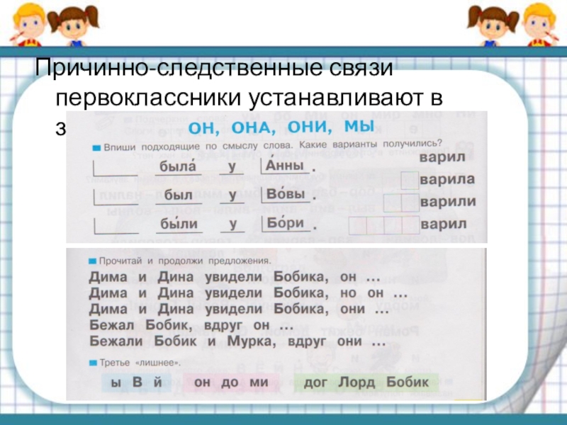 Слайд 18Причинно-следственные связи первоклассники устанавливают в заданиях