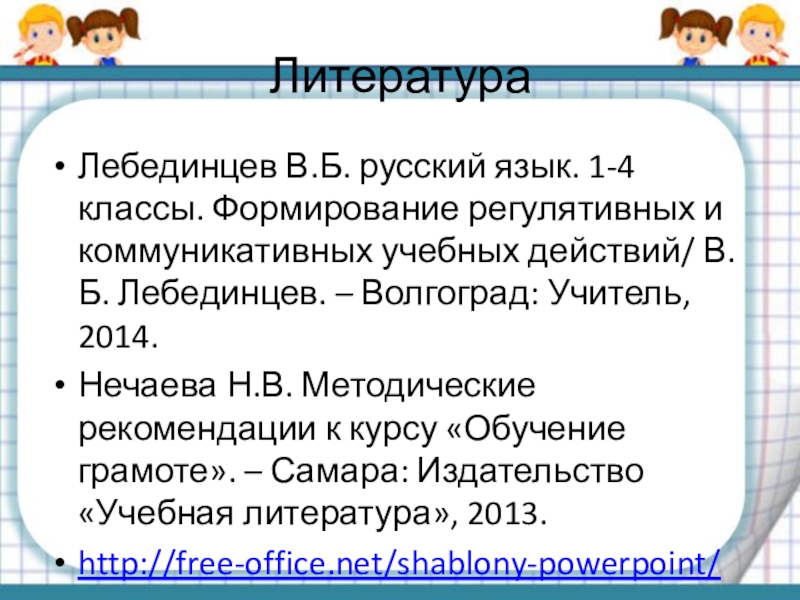 Нечаева Н.В. Методические рекомендации к курсу «Обучение грамоте». – Самара: Издательство «Учебная литература», 2013.