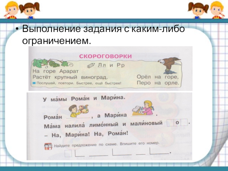 Слайд 11Выполнение задания с каким-либо ограничением.