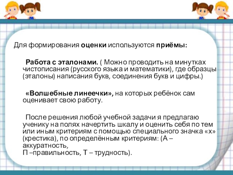После решения любой учебной задачи я предлагаю ученику на полях начертить шкалу и оценить себя по тем или иным критериям с помощью специального значка «х» (крестика), по определённым критериям: (А – аккуратность,