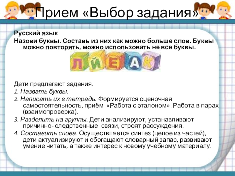 4. Составить слова. Осуществляется синтез (целое из частей), дети актуализируют и обогащают словарный запас, развивают умение читать, а также интерес к новому учебному материалу.