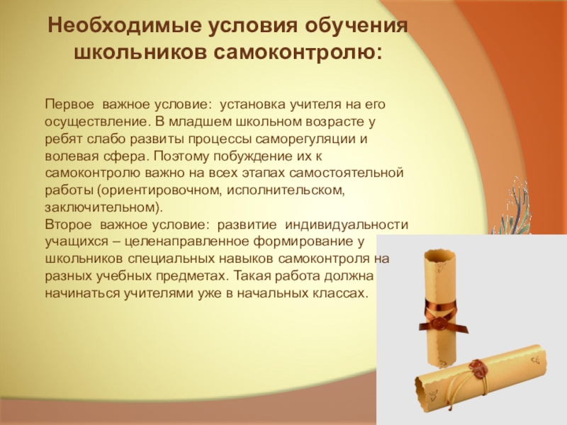 Необходимые условия обучения школьников самоконтролю: