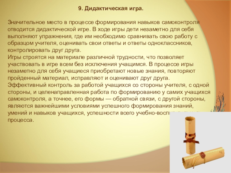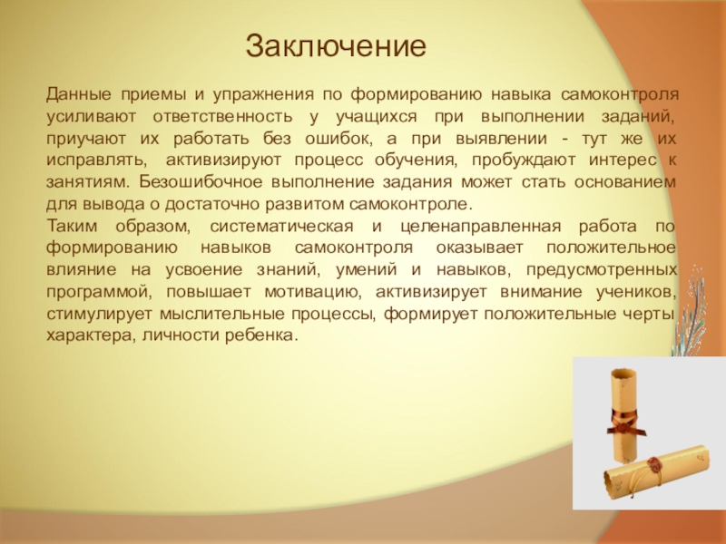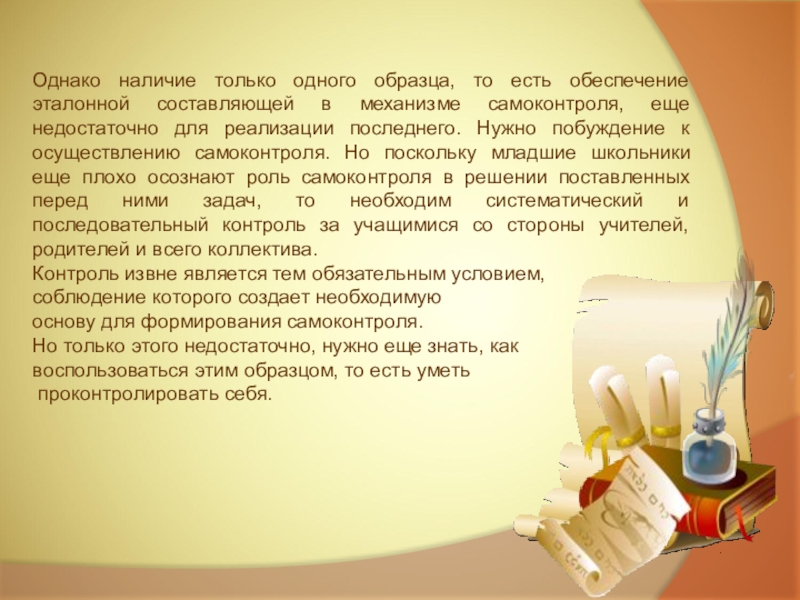 Еще в начале второго класса школьники, как правило, не обнаруживают потребности в самоконтроле при овладении данным предметом. Контроль за правильностью собственных действий предполагает овладение учащимся специальными приемами и способами осуществления самоконтроля. В качестве обязательного условия самоконтроля выступает наличие у учащихся необходимого запаса знаний и умений пользоваться ими. Самоконтроль формируется медленнее, чем приобретаются знания.