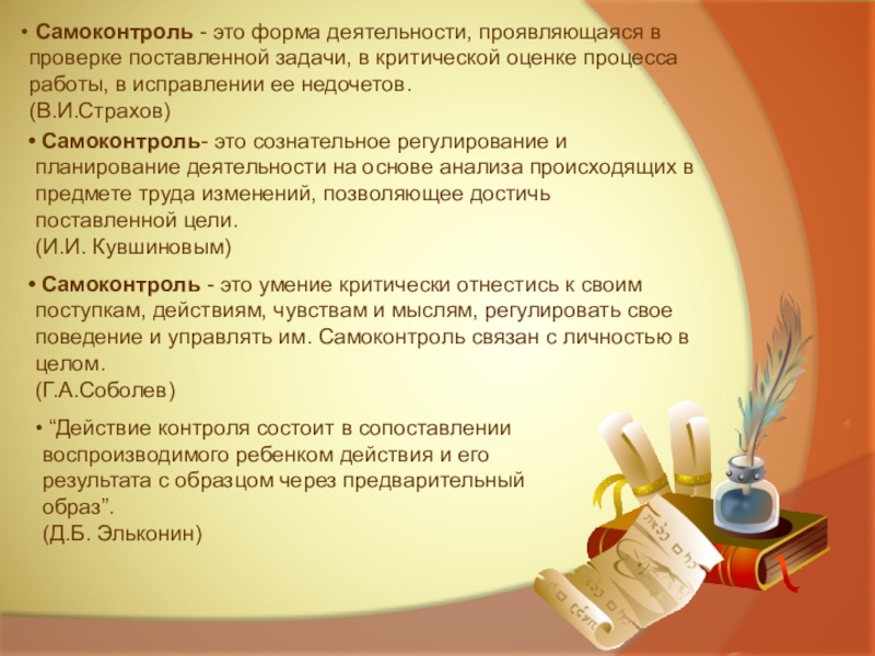 Самоконтроль- это сознательное регулирование и планирование деятельности на основе анализа происходящих в предмете труда изменений, позволяющее достичь поставленной цели.
