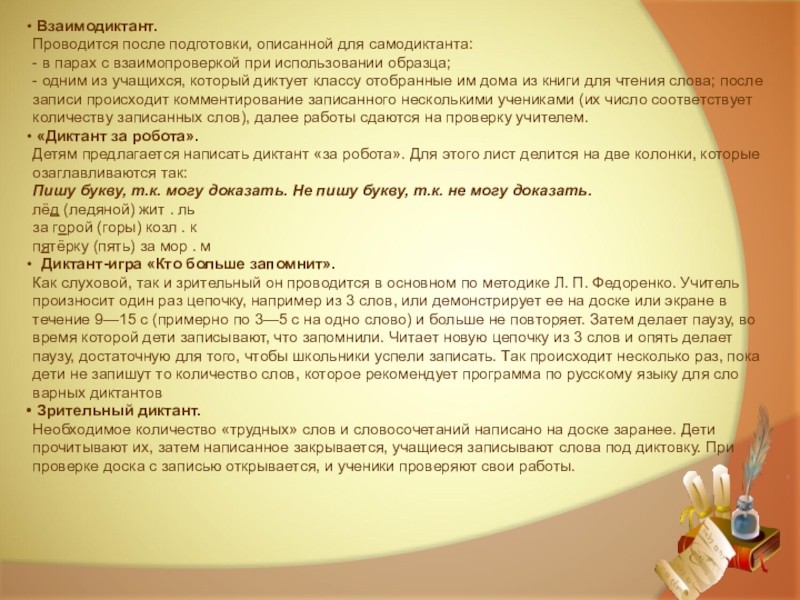 Эта игра позволяет включить в скучный процесс запоминания словарных слов наибольшее количество анализаторов, что делает её эффективной, даёт возможность сменить положение тела и является алгоритмом заучивания слов с непроверяемыми орфограммами.
