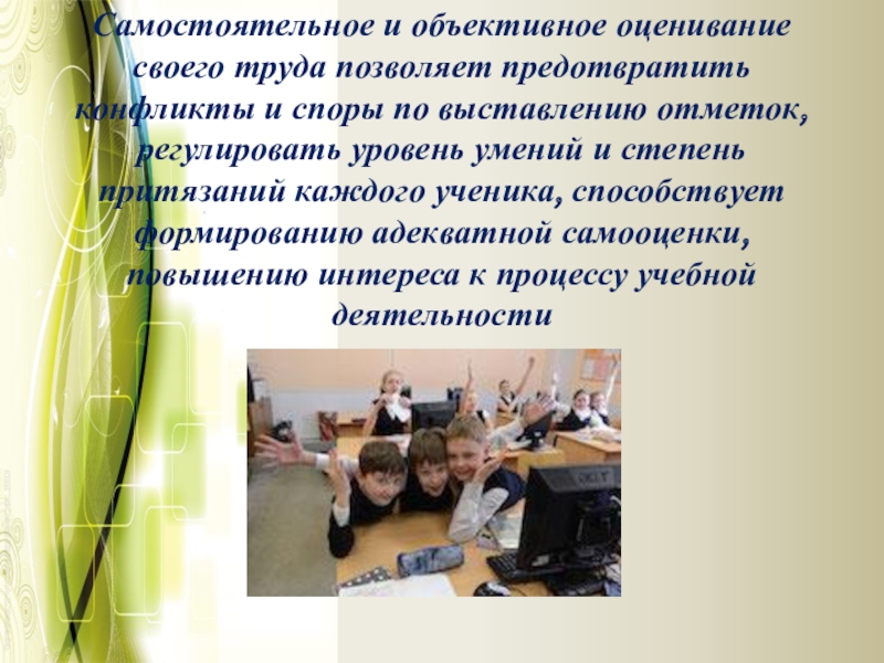Слайд 21Самостоятельное и объективное оценивание своего труда позволяет предотвратить конфликты и споры